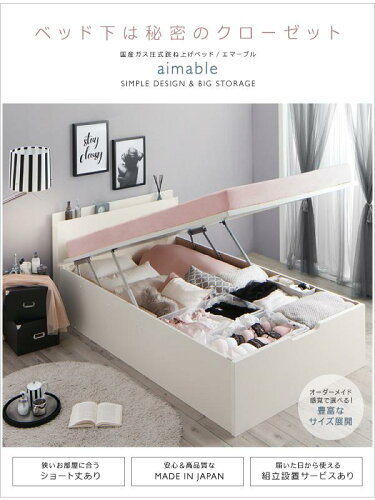 ?クローゼット感覚で使える ガス圧式跳ね上げベッド?aimable エマーブル【サイズ】●本体最大外寸●≪ラージ・グランド共通≫<レギュラー丈>セミシングル:(約)207x83x80シングル:(約)207x98x80セミダブル:(約)207x120x80<ショート丈>セミシングル:(約)192x83x80zxシングル:(約)192x98x80●床から床面までの高さ●≪ラージ≫全サイズ共通:(約) 37≪グランド≫全サイズ共通:(約) 44●収納部有効内寸●≪ラージ≫<レギュラー丈>?セミシングル:(約)193x77x31?シングル:(約)193x92x31?セミダブル:(約)193x114x31<ショート丈>?セミシングル:(約)178x77x31?シングル:(約)178x92x31≪グランド≫<レギュラー丈>?セミシングル:(約)193x77x38?シングル:(約)193x92x38?セミダブル:(約)193x114x38<ショート丈>?セミシングル:(約)178x77x38?シングル:(約)178x92x38【材質】プリント化粧繊維板【生産国】日本【カラー】ホワイト【耐荷重】全サイズ共通:(約)180kg【製品重量】各種サイズ一覧はコチラ【必ずお読みください】■商品はご注文順にて引き当てますので、在庫がありましても欠品になる場合がございますのでご了承ください。